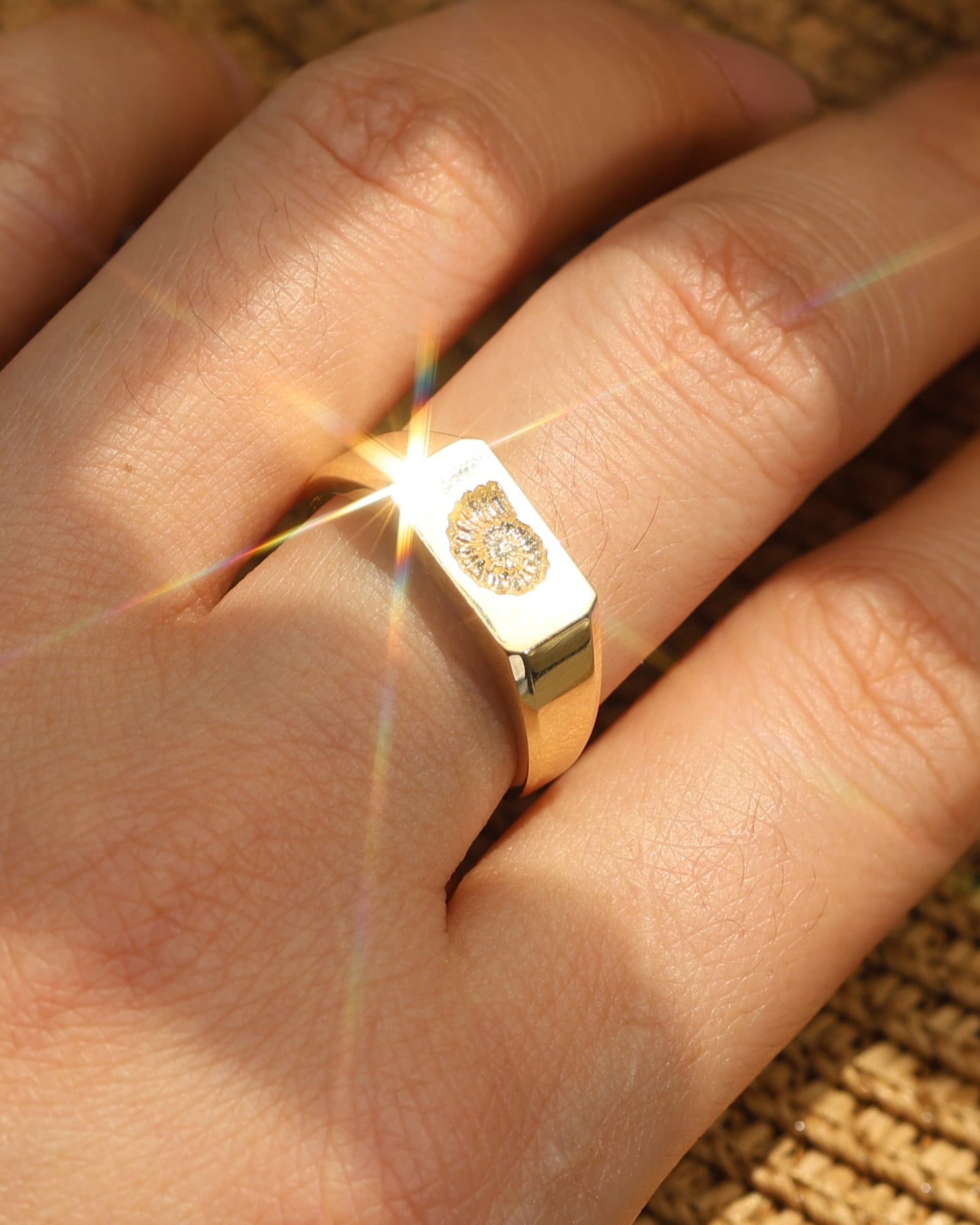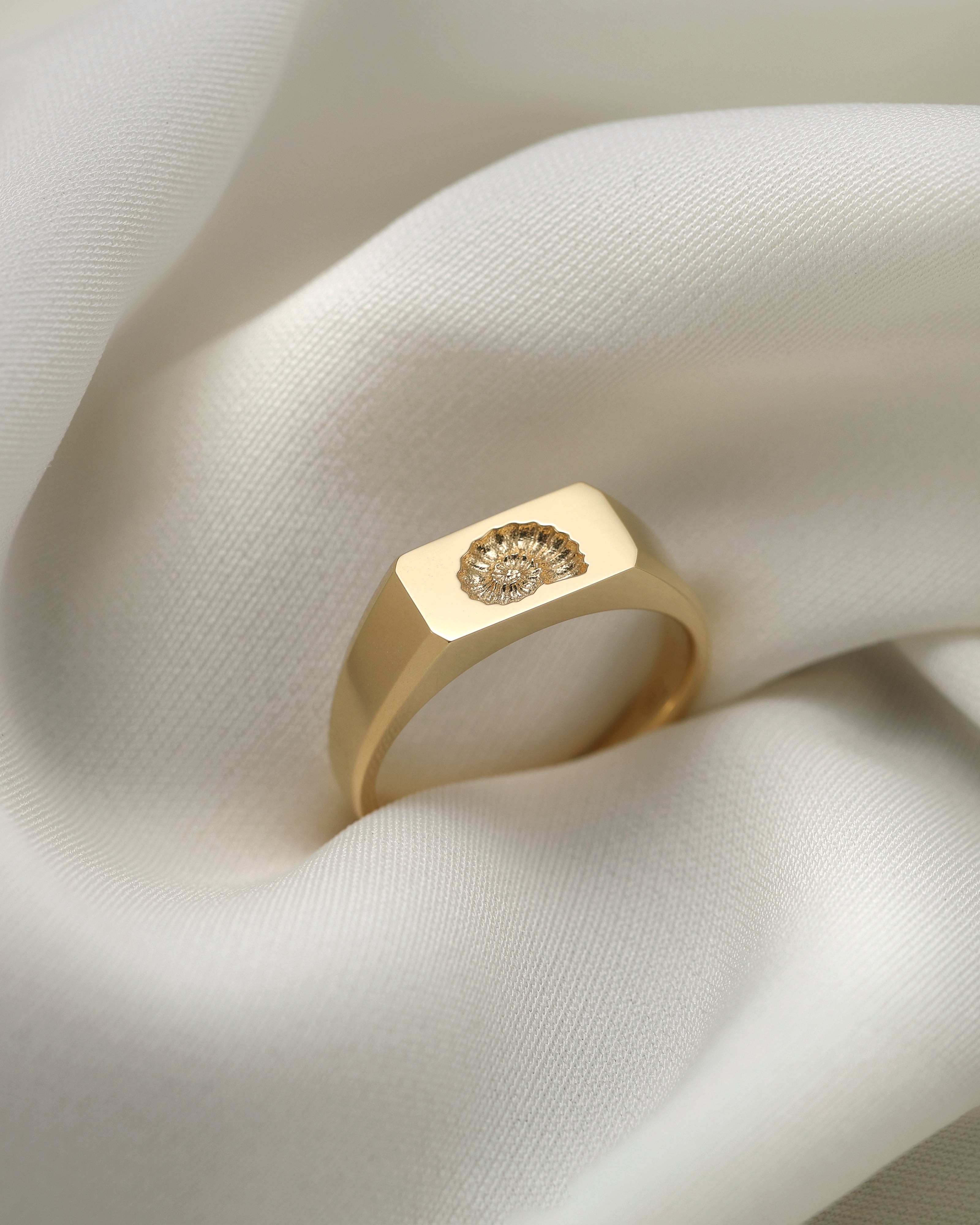 The Ammora Ring offers a timeless and elegant addition to any jewelry collection. Crafted with 14k gold and featuring a delicate fossil design, this piece showcases a contemporary take on Scandinavian design. Elevate any outfit with this unique and luxurious accessory.